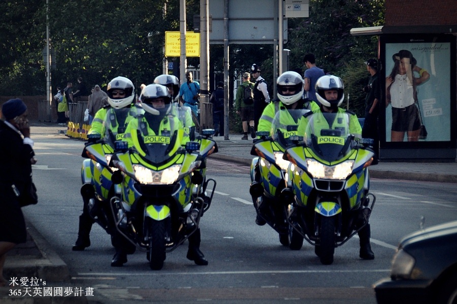 首先我們是由一群金光閃閃的警察們為奧運聖火境香團開路。