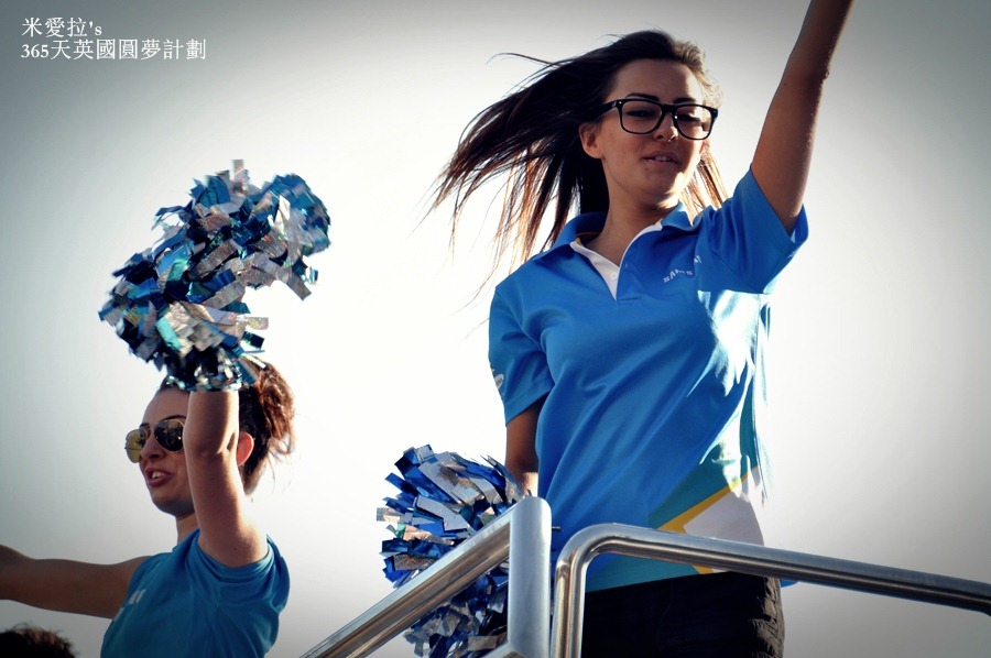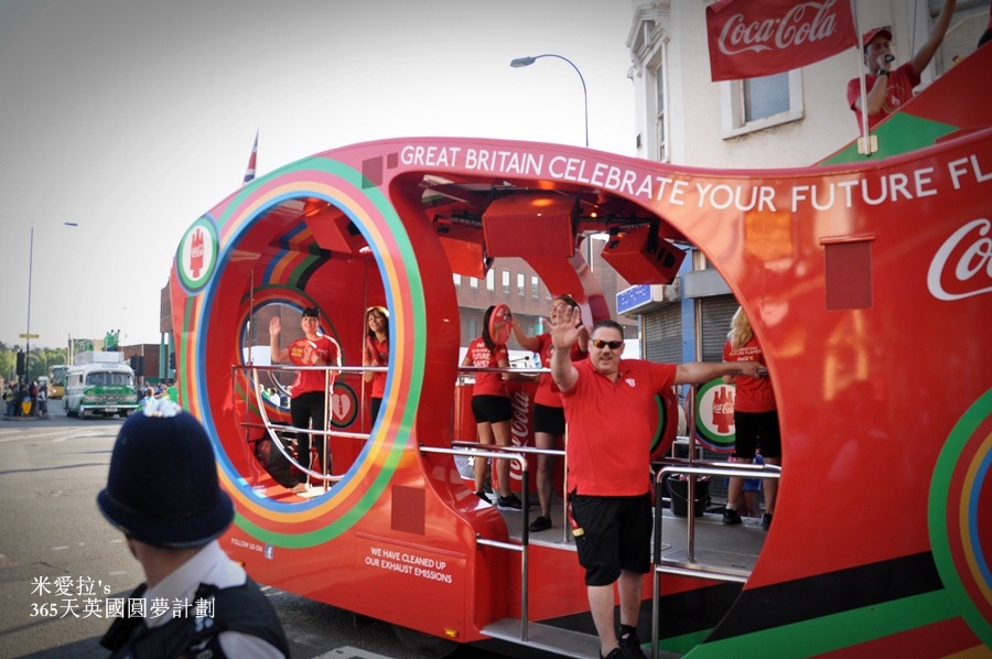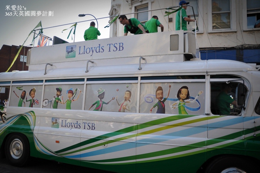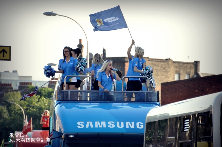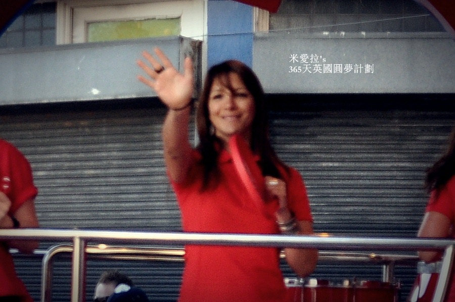說實在的如果不是我們自己很High,這贊助廠商的車隊感覺還蠻冷清的…就3車而已、車上的人不多、而且沿街發放的東西越來越弱,雖然他們試圖要炒熱氣氛,可是在圍觀者的眼中卻覺得一陣感傷 (<-- 好啦,起碼我一個人啦),英國這次的奧運是有多窮啊? 本來期待有種森巴嘉年華會般熱鬧的聖火傳遞,就這樣稀稀疏疏的兩車人馬…
