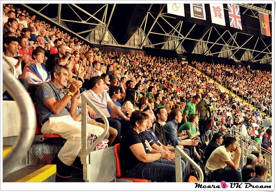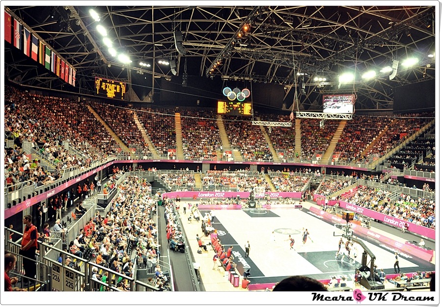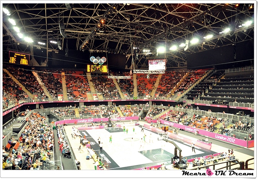 因為超盧又不耐飢的我堅持一定要吃完午餐才去看比賽,害得可憐的黑羊兄要陪著我一路在奧運會場競走 (籃球場館怎麼這麼遠),才終於在遲到了4分23秒候滑壘進入籃球館。到的時候我們兩個人都氣喘呼呼,汗流浹背,完全不像是要看比賽的,反而比較像是剛比完賽的><