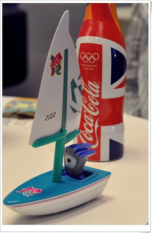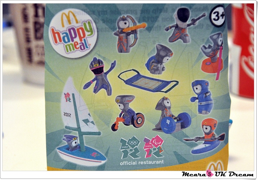 那天我的我不知道為什麼突然想吃起司漢堡 (但是又不想吃大亨堡),以及4塊雞塊 (還不要6塊的喔) (<-- 整個就是個非常難搞的客人),而誤打誤撞的點了快樂兒童餐,結果,將將將~我獲得了一個划船的奧運吉祥物 Wenlock!