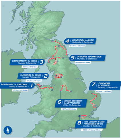 英國人真的很會騎腳踏車,從倫敦奧運得獎的排數就可以看出。這個環英賽事從北威爾斯出發,經過愛丁堡,英格蘭最西北邊的坎布里亞山區(Cumbria)直到倫敦, 終點在倫敦,據說今年的路途比往年都要辛苦。至於倫敦路徑的部分和往年一樣,在白廳路 (Whitehall Road出發),沿著泰晤士北岸騎,直到倫敦塔橋,之後原路折返到出發地點結束。